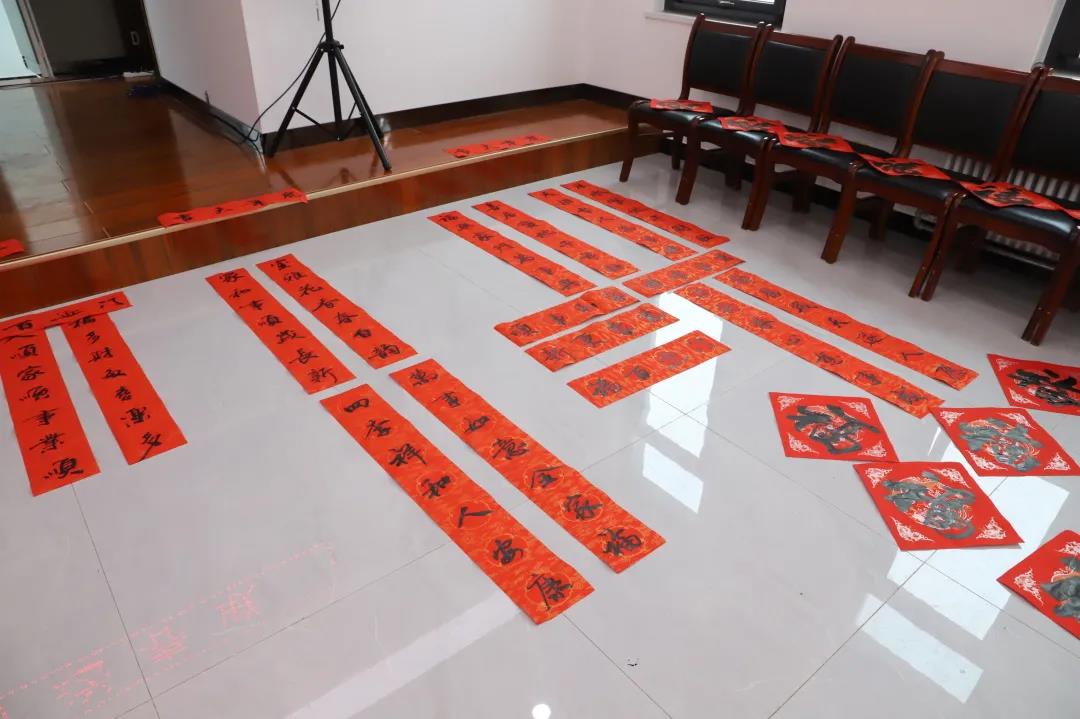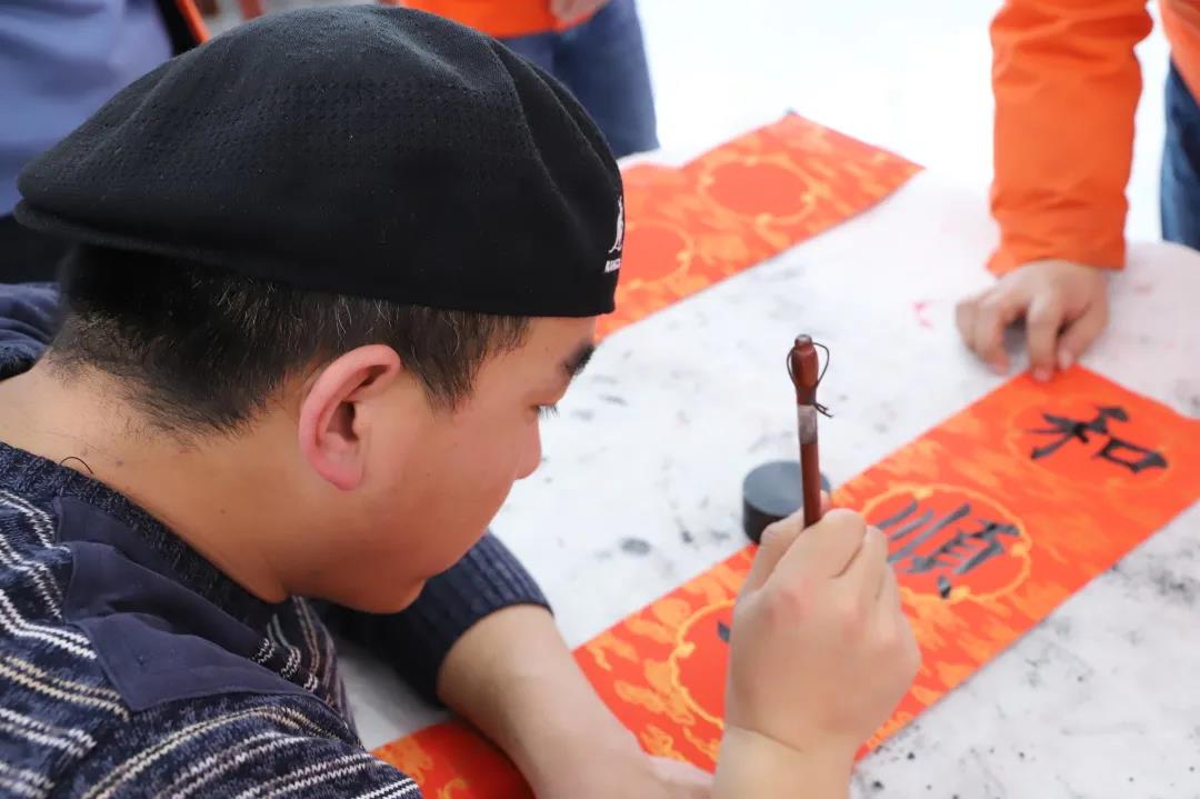 筆走龍蛇間,一張張筆酣墨飽、寓意吉祥的“?!弊帧⒋郝?lián)躍然紙上。集團(tuán)各單位書法愛好者和員工們早早來到書寫現(xiàn)場,一邊幫著鋪紙調(diào)墨,一邊井然有序地向書法家們“求”取自己中意的春聯(lián)和美好祝福。兩個多小時,書法家們共寫出了200余幅作品,并現(xiàn)場講解釋義、互動交流,活動現(xiàn)場鋪滿了春聯(lián)和福字,形成了一片熱鬧非凡的紅色海洋。