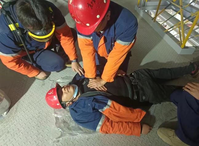 本次演練模擬化工熱電公司35T2#鍋爐床溫?zé)犭娕急淮擦蠜_刷時(shí),檢修工作人員進(jìn)入爐膛檢查熱電偶測量端時(shí),發(fā)生爐膛窒息事故,導(dǎo)致檢修人員昏迷倒地,情況十分危急。事故發(fā)生后,化工熱電公司立即啟動(dòng)應(yīng)急預(yù)案,在總指揮的調(diào)度下,現(xiàn)場搶險(xiǎn)組攜帶測氧儀并戴好正壓式氧氣呼吸器,對檢修窒息人員組織搶救,將其抬出爐膛并進(jìn)行心肺復(fù)蘇和人工呼吸,使窒息人員逐漸恢復(fù)呼吸與心跳。整個(gè)演練歷時(shí)1小時(shí)。