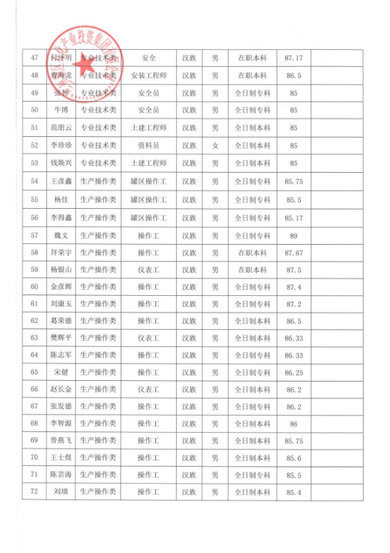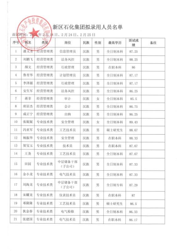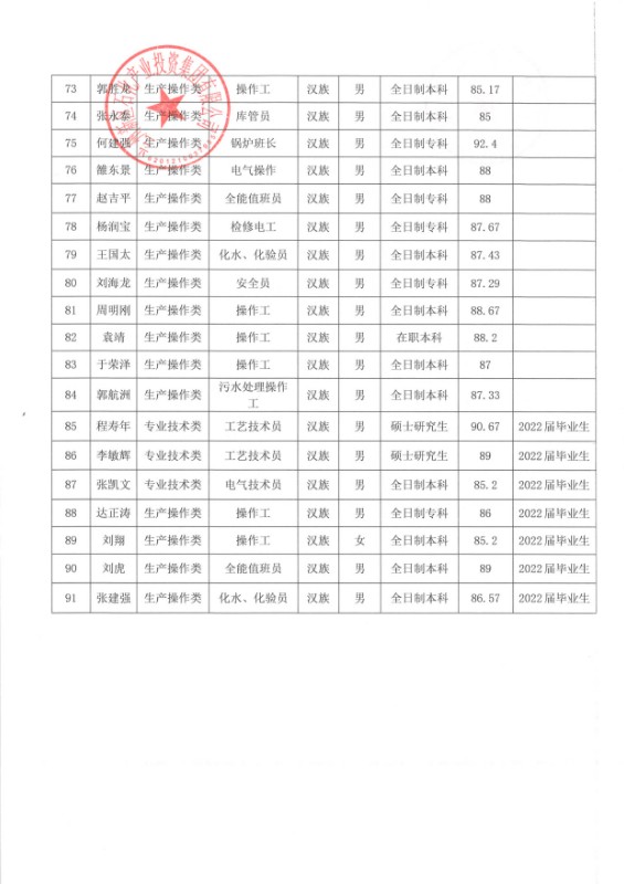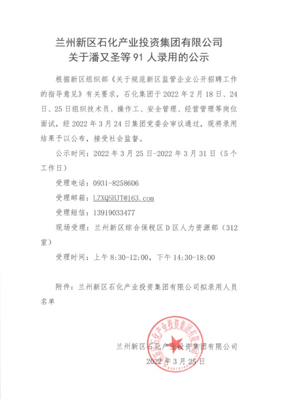 蘭州新區(qū)石化產(chǎn)業(yè)投資集團有限公司關于潘又圣等91人錄用的公示