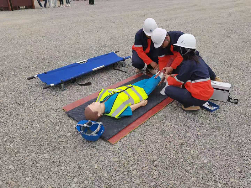 演練地點(diǎn)選擇存在高處作業(yè)風(fēng)險(xiǎn)的裝卸車棧臺(tái)管廊橋架,模擬了施工人員不慎從高處作業(yè)平臺(tái)墜落的情景。事故發(fā)生后,現(xiàn)場(chǎng)安全巡檢人員第一時(shí)間向應(yīng)急救援領(lǐng)導(dǎo)小組組長(zhǎng)報(bào)告,組長(zhǎng)立即啟動(dòng)應(yīng)急救援預(yù)案。各小組奔赴現(xiàn)場(chǎng)后,立即分析現(xiàn)場(chǎng)情況,警戒組拉設(shè)警戒線封鎖現(xiàn)場(chǎng),醫(yī)療救護(hù)組立即對(duì)傷著進(jìn)行現(xiàn)場(chǎng)急救,工程搶險(xiǎn)組對(duì)現(xiàn)場(chǎng)道路進(jìn)行疏通,各救援小組各司其職,迅速開(kāi)展應(yīng)急救援和搶險(xiǎn)。