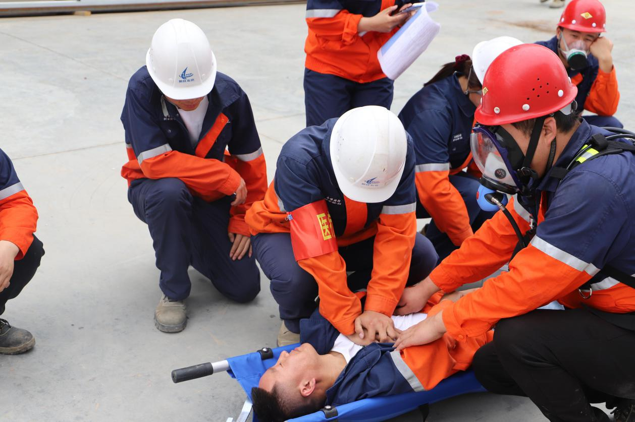 演練從實戰(zhàn)出發(fā),現(xiàn)場總指揮劉鵬宣布啟動專精特新公司泄漏中毒應急預案后,各應急救援立即展開行動:現(xiàn)場保衛(wèi)組立即進行人員疏散和現(xiàn)場警戒、后勤保障組攜帶應急救援物資迅速抵達現(xiàn)場隨時準備補給救援物資、醫(yī)療救護組第一時間將中毒受傷人員經過簡單救護后送至救護車、通訊保障組調試所有通訊設備保證救援過程通訊暢通、事故搶險組戴空氣呼吸器,身穿重型防化服攜帶堵漏工具在現(xiàn)場利用氯氣捕消器,水幕水帶、專業(yè)堵漏工具等進行搶險處置……救援人員各司其職,各環(huán)節(jié)有條不紊、井然有序。經過20分鐘的排險、噴淋,氯氣泄漏成功處置,環(huán)境檢測空氣正常,演練結束。