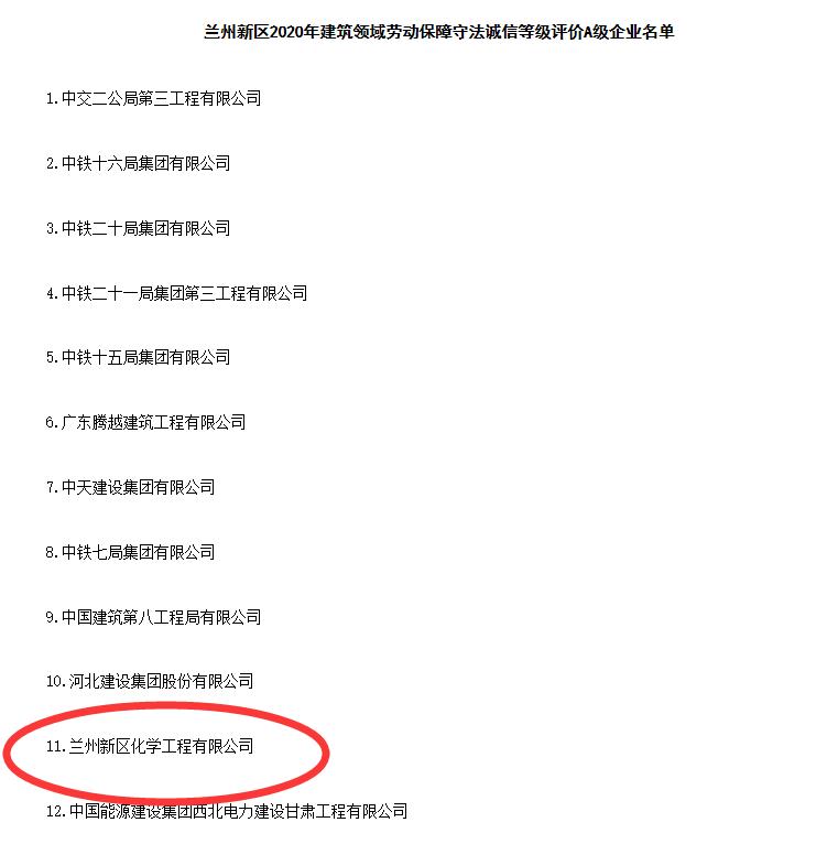 近日,從蘭州新區(qū)民政司法和社會保障局獲悉,蘭州新區(qū)化學(xué)工程有限公司被認(rèn)定為蘭州新區(qū)2020年建筑領(lǐng)域勞動保障守法誠信等級評價A級企業(yè),成為蘭州新區(qū)唯一一家獲得此榮譽(yù)的新區(qū)國有企業(yè)。