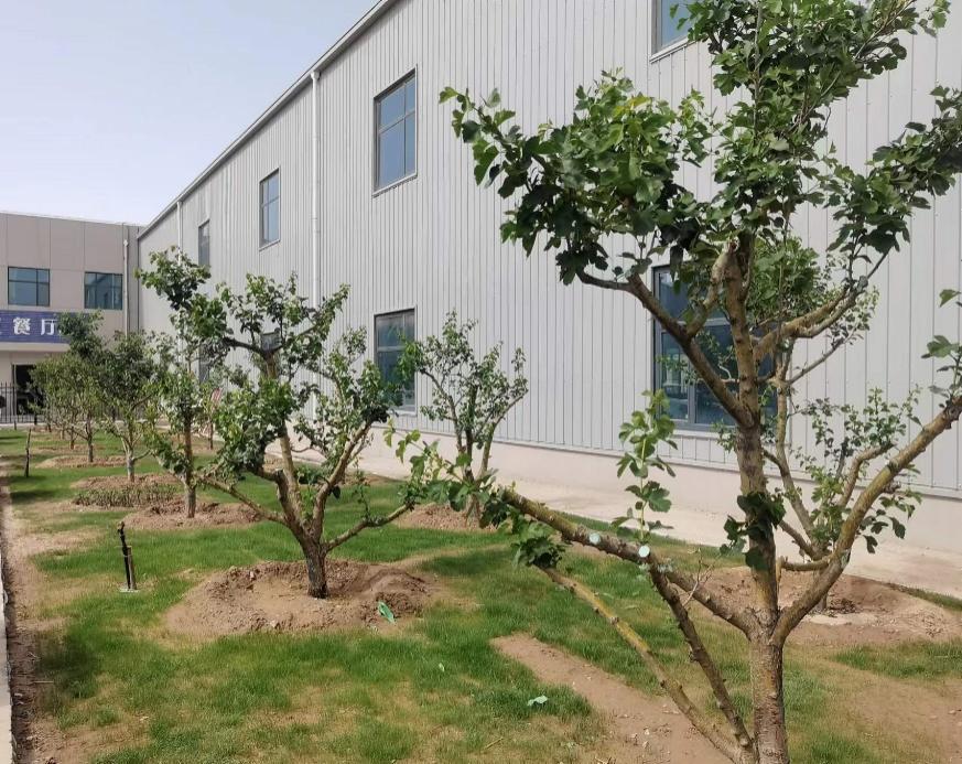 因地制宜,確定綠化方案。公司以“凈化美化環(huán)境,改善區(qū)域小氣候”為綠化主要原則,按功能區(qū)對(duì)廠區(qū)空地進(jìn)行不同的綠化布置。在廠區(qū)北門口兩側(cè)種植9棵梧桐樹,象征著栽桐引鳳之意。廠區(qū)主干道路兩側(cè)選用高大闊葉喬木樹種,綠化帶內(nèi)種植草坪,辦公樓兩側(cè)栽植四季玫及常青圓柏冬青球組合,廠前區(qū)栽植山楂樹,廠區(qū)西側(cè)栽植山楂樹、杏樹和梨樹。