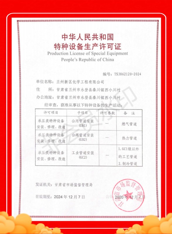 2020年12月7日,石投集團(tuán)化學(xué)工程公司順利取得了由甘肅省市場監(jiān)督管理局批準(zhǔn)的《特種設(shè)備壓力管道安裝許可證》,該許可證是新區(qū)首個壓力管道安裝許可證。