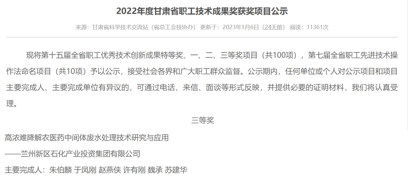 近日,甘肅省總工會(huì)對(duì)2022年度甘肅省職工技術(shù)成果獎(jiǎng)獲獎(jiǎng)項(xiàng)目進(jìn)行了公示,石化集團(tuán)博石環(huán)保公司《高濃難降解農(nóng)醫(yī)藥中間體廢水處理技術(shù)研究與應(yīng)用》獲得三等獎(jiǎng)。