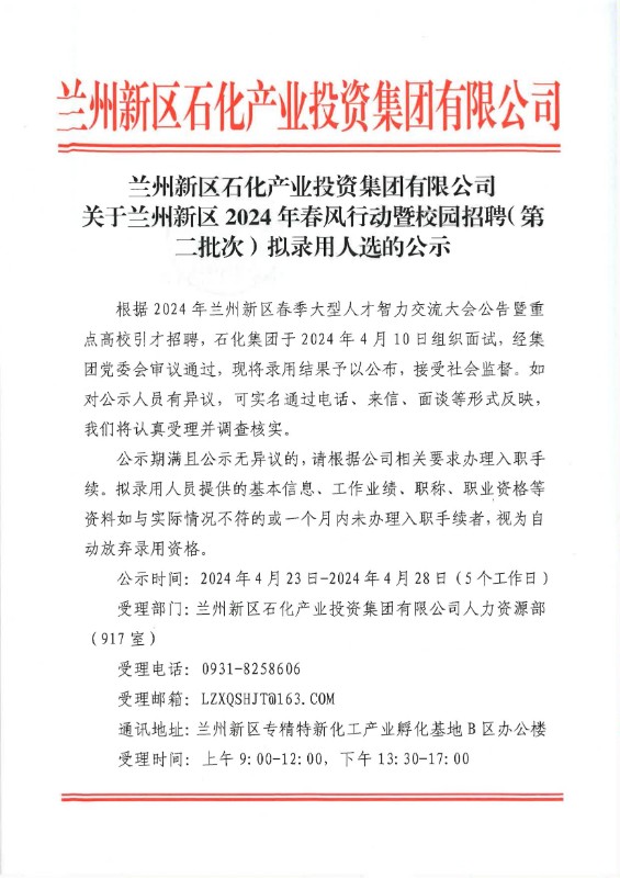 蘭州新區(qū)石化產(chǎn)業(yè)投資集團(tuán)有限公司 關(guān)于蘭州新區(qū)2024年春風(fēng)行動(dòng)暨校園招聘(第二批次)擬錄用人選的公示